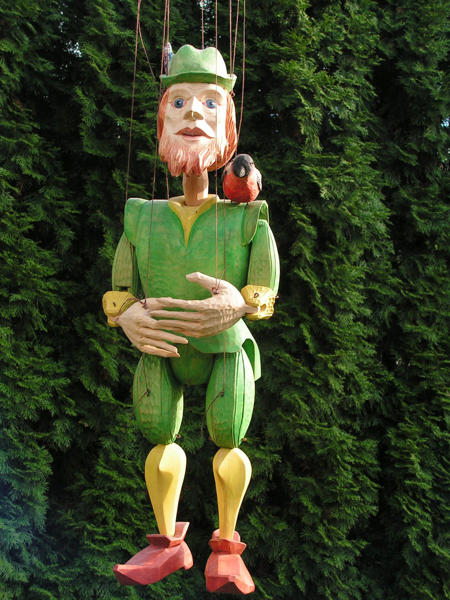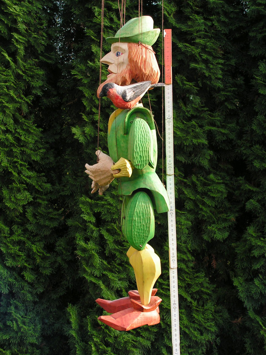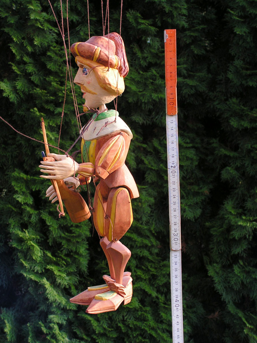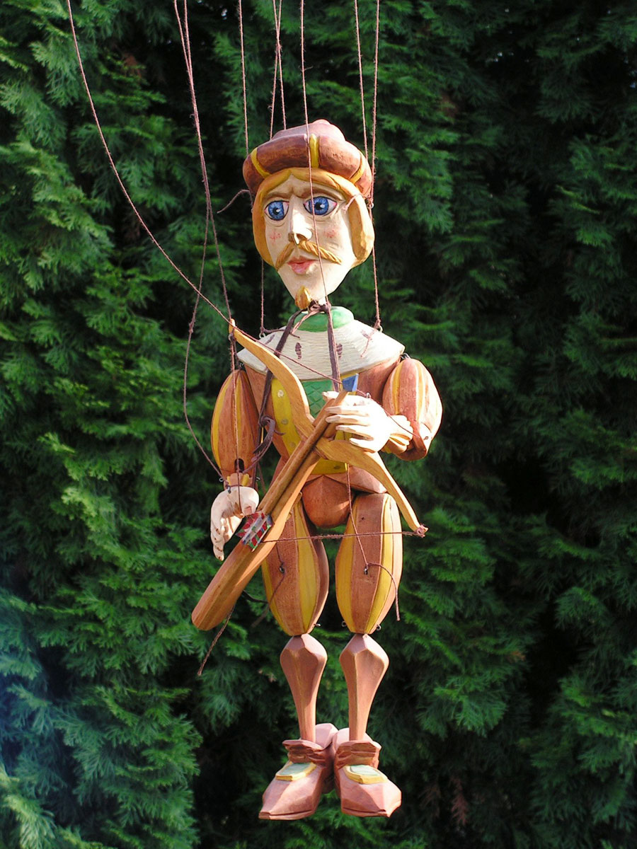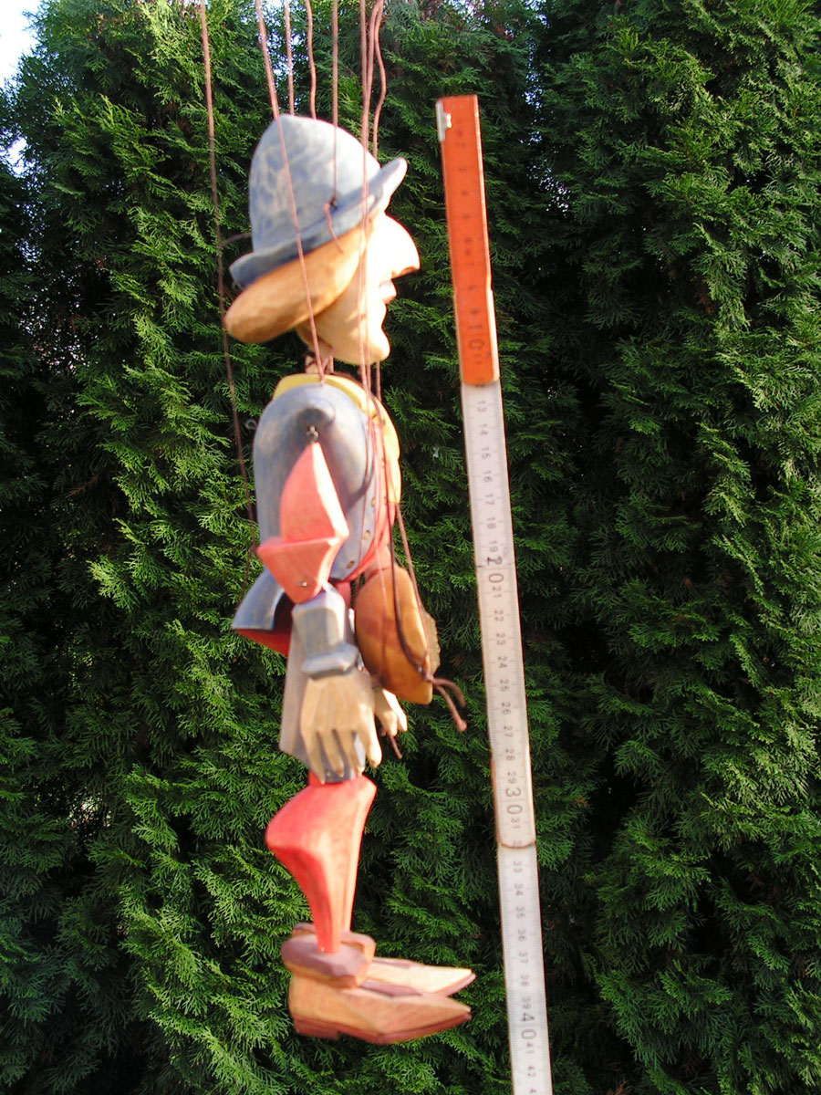 Originální celořezbovaná loutka. Pohyblivé klouby umožní maximální ovládání, barevná polychromie, propracovaný detail, ovládání přes kříž a nitě.