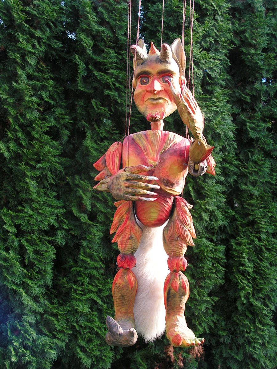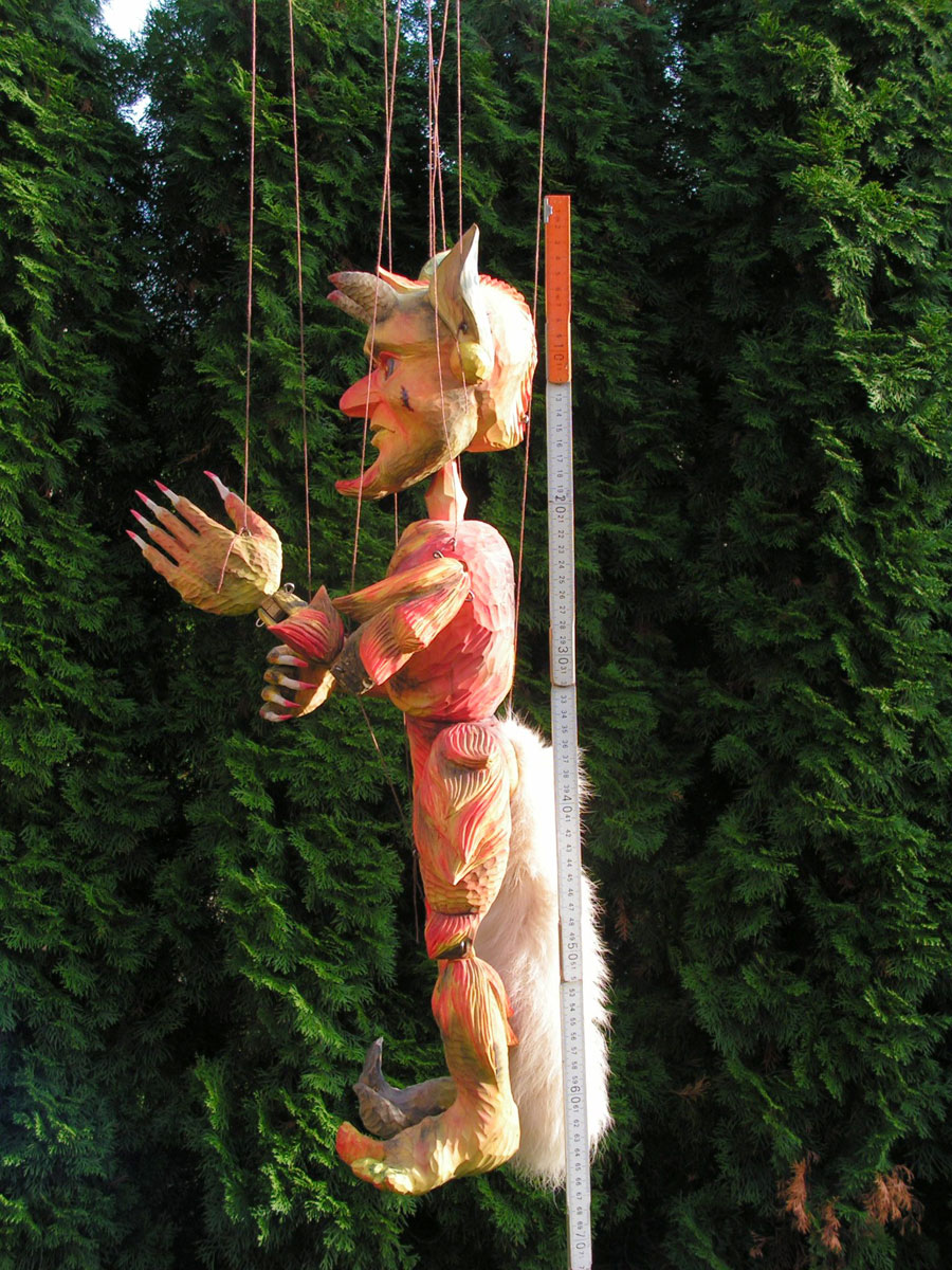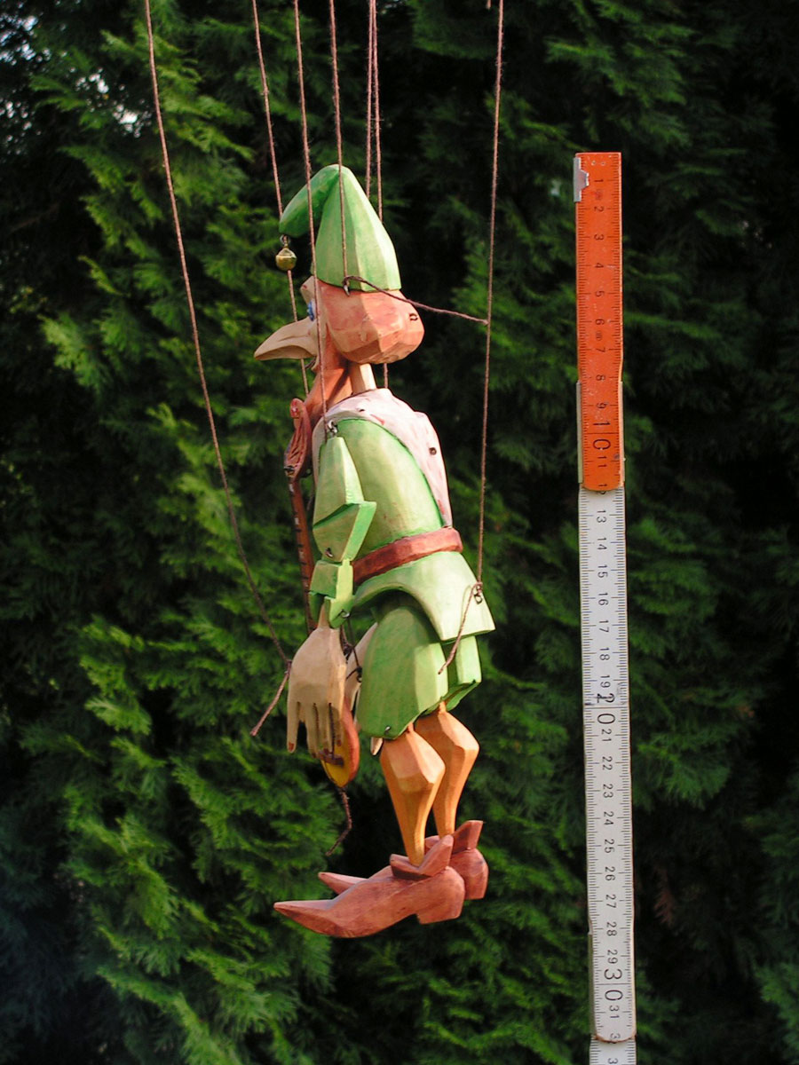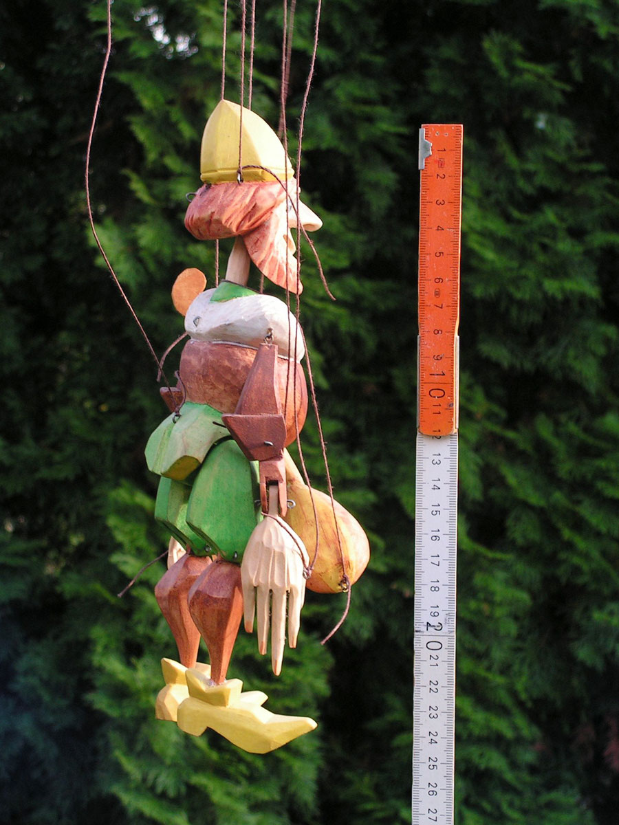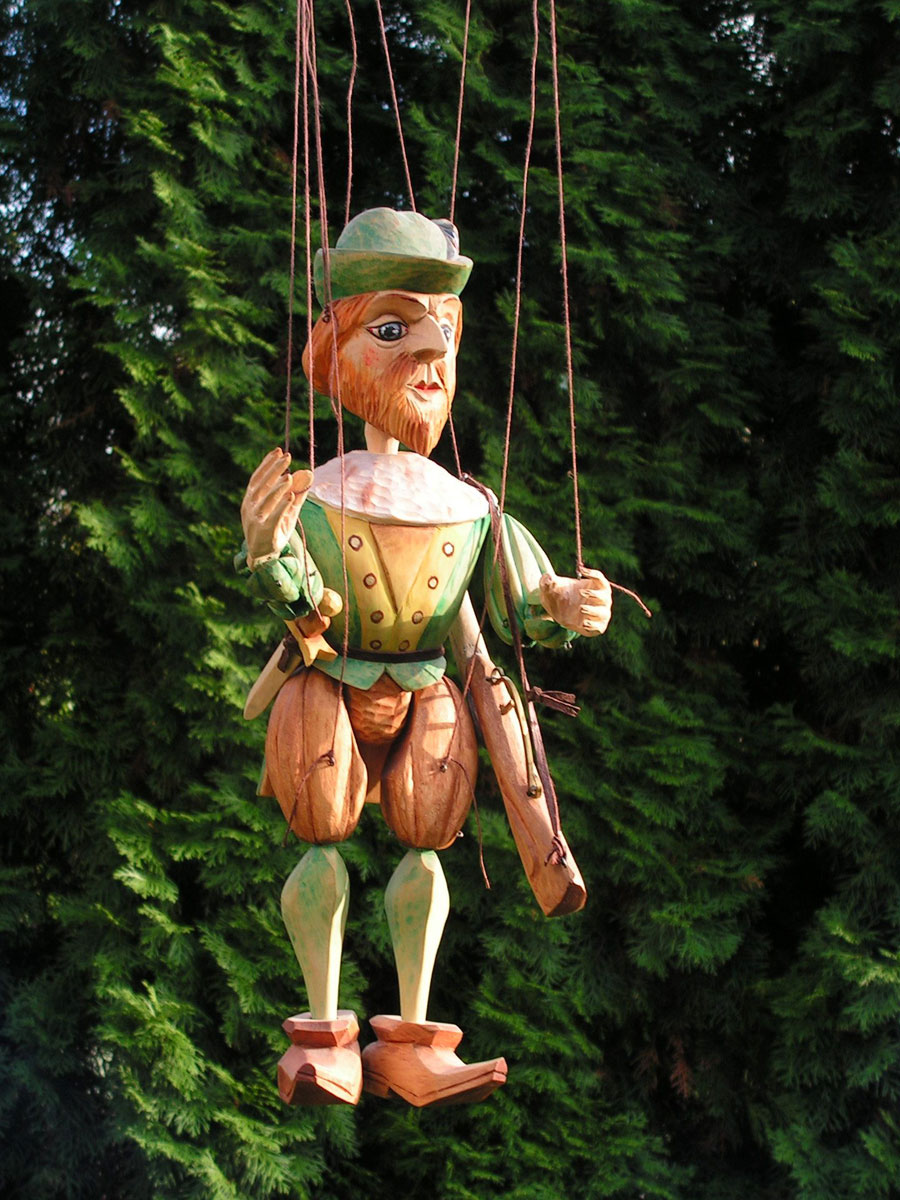 Originální celořezbovaná loutka. Pohyblivé klouby umožní maximální ovládání, barevná polychromie, propracovaný detail, ovládání přes kříž a nitě.