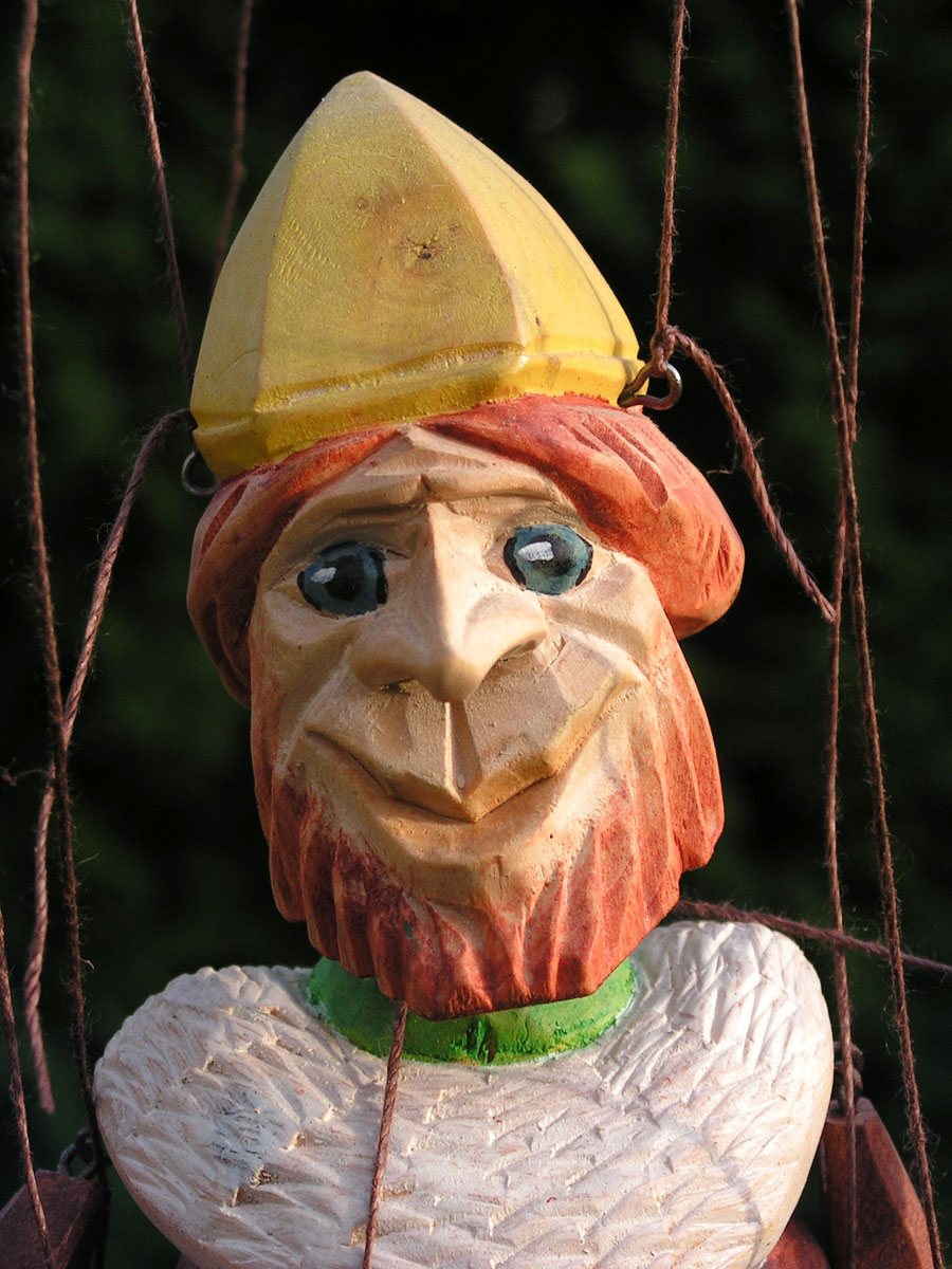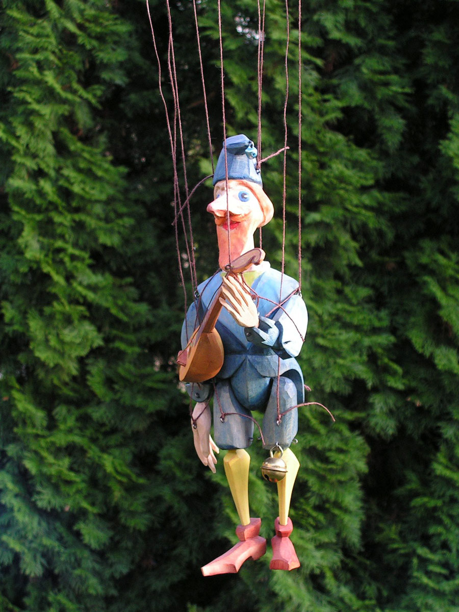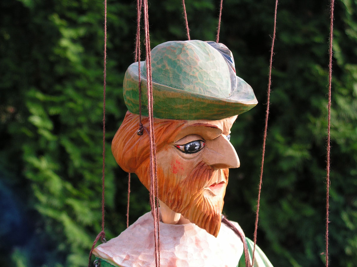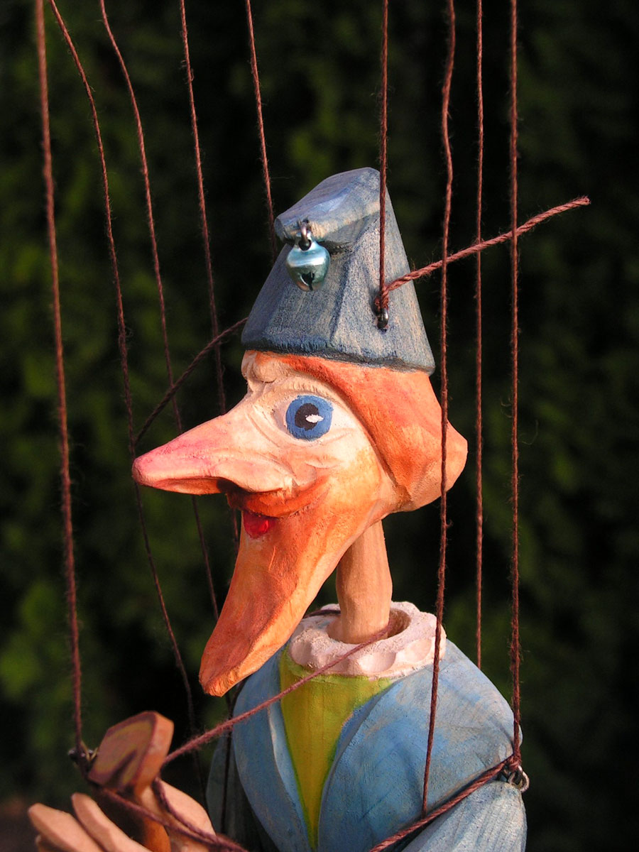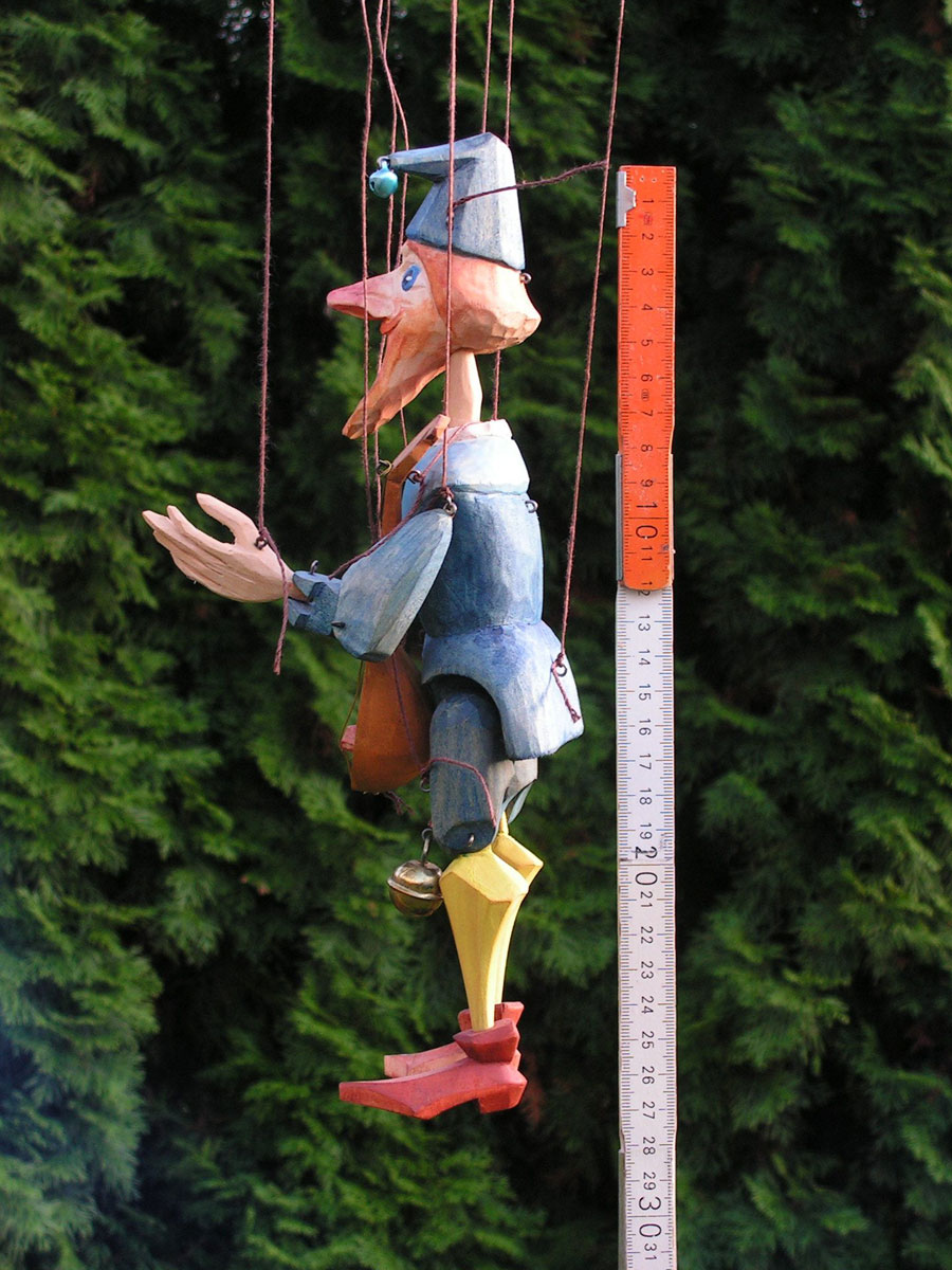 Originální celořezbovaná loutka. Pohyblivé klouby umožní maximální ovládání, barevná polychromie, propracovaný detail, ovládání přes kříž a nitě.